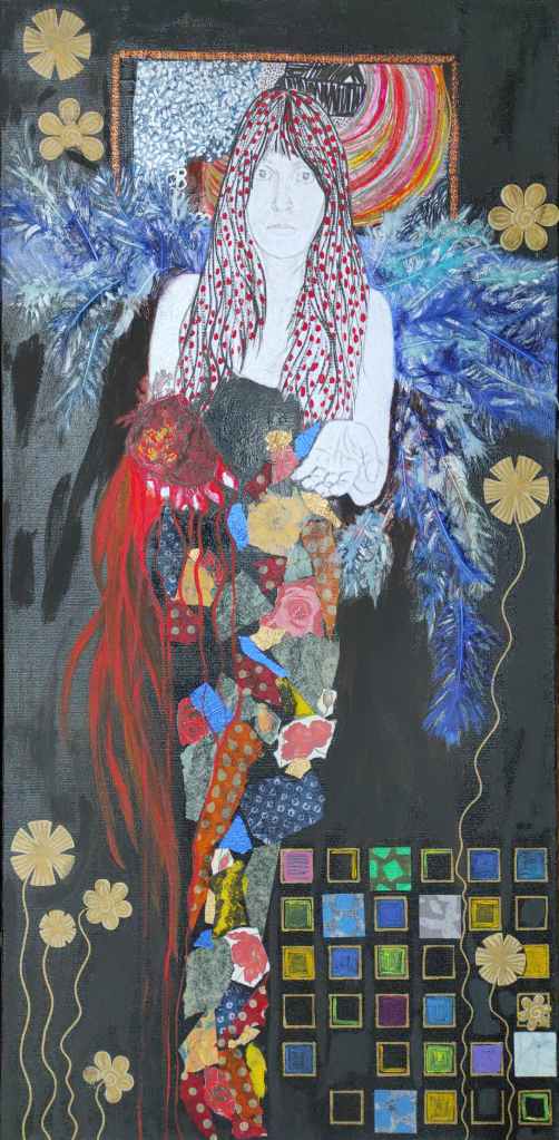 *** pour peindre, je déballe tout, j’étale tout : tout doit être à immédiate disposition parce qu’une fois que la vanne est ouverte, ça fuse, ça ne s’arrête guère. Tout, c’est quoi ? Tubes de peintures diverses, feutres, crayons de couleur, pastels, plumes, serviettes de papier coloré, feuilles d’or, dentelles de vieux sous-vêtements usés, papier de soie, papiers brillants de chocolats, cigarettes et Mozart Kugeln, pigments fins, ficelles, bouts de laine etc… Si je commence ma journée de peinture après 10 heures, j’estime que ça ne vaut pas la peine. Je m’arrête faute de carburant vers 19h, exténuée.