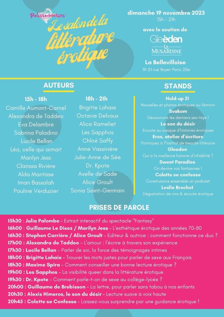 Salon de la littérature Erotique Nov 17 2023 Dimanche 19 novembre 2023 La Bellevilloise19-21 rue Boyer Paris 20e Partager : Partager sur Facebook(ouvre dans une nouvelle fenêtre) Facebook Partager sur LinkedIn(ouvre dans une nouvelle fenêtre) LinkedIn Partager sur Threads(ouvre dans une nouvelle fenêtre) Threads Partager sur Mastodon(ouvre dans une nouvelle fenêtre) Mastodon Partager sur Bluesky(ouvre dans une nouvelle fenêtre) Bluesky J’aime chargement… Publié par Anne Vassiviere Voir tous les articles par Anne Vassiviere
