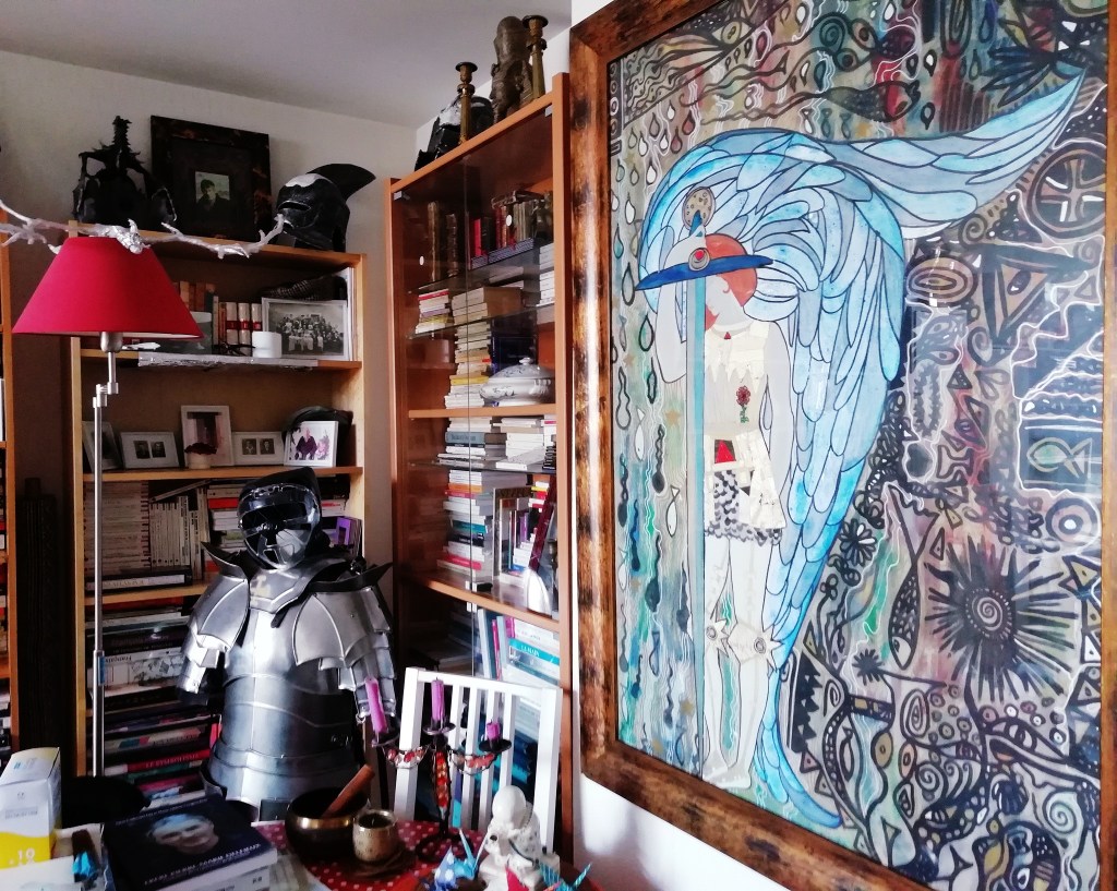 Ce tableau adoubé d’un mot bouleversant de ma fille remerciant ses parents de lui avoir donné la vie m’est essentiel. J’y ai mis mon amour du foisonnement de la vie, un enthousiasme presque canin, une confiance toujours. Une fidélité que beaucoup d’entre vous reconnaîtront. Je suis une gardienne, comme le chevalier, la chevalière du tableau.