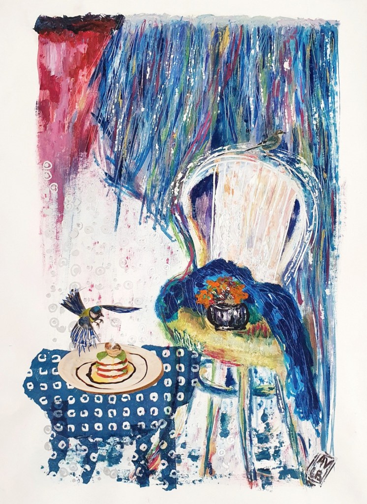 Deux oiseaux dans cette toile. Un posé, un qui volette. Le même en réalité. Le plus petit du royaume est plus grand que nous.