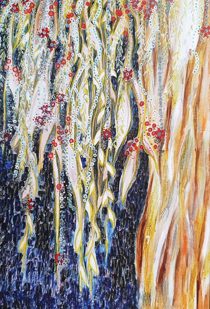 Parfois on a besoin d’un tronc solide sur lequel s’appuyer avant de reprendre la course un peu folle de sa vie. Et quand on est entourée de béton, autant se créer son propre mat d’écorce. C’est ce que j’ai fait avec cette huile de 116 x 82 cms, j’ai peint un compagnon de bois portatif. Un tronc solide qui accueille ma fatigue et la change en chevelure de feuilles dorées rehaussées de rouge. Dehors, la nuit peut bien être bleue à se perdre, cette toile me tient toute entière dans ses bras hors de portée du béton et sa froideur.