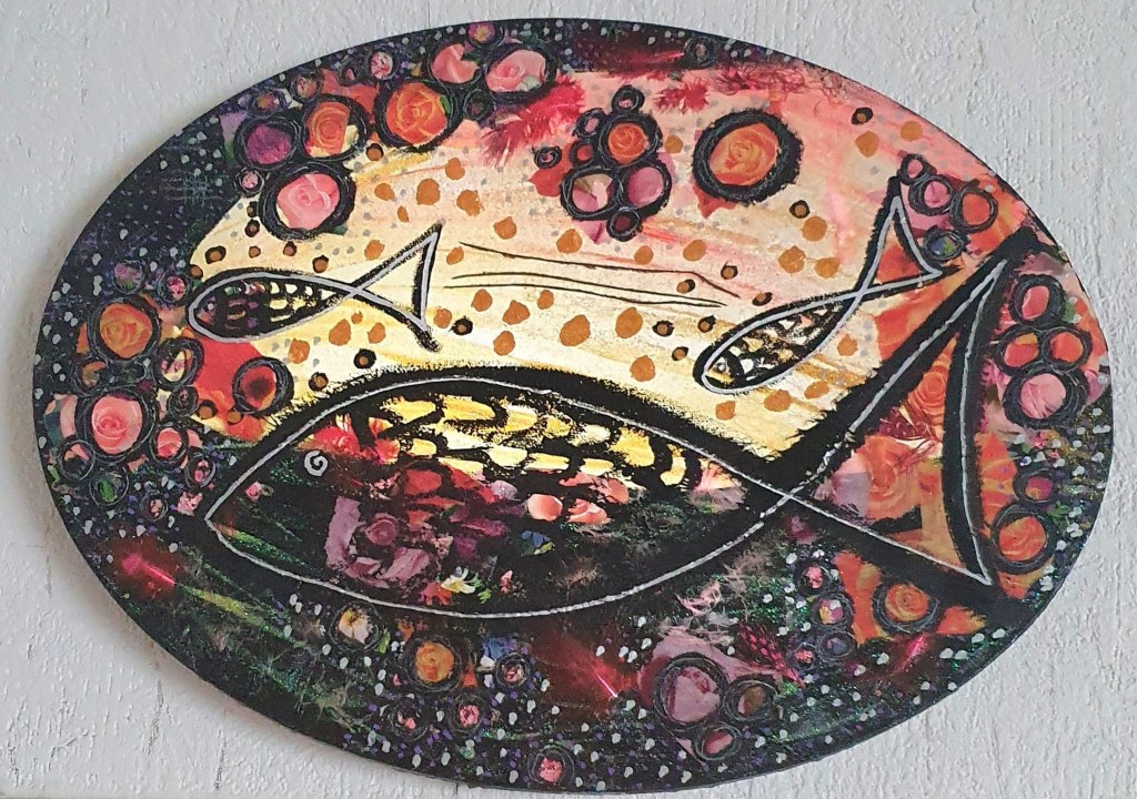 J’ai peint deux poissons cousins, chacun dans son ovale, sa matrice, son liquide amniotique. Puis ils m’ont dit leur nom: Pierre et Paul. Apôtres. Je ne m’y attendais pas du tout. Celui que je vous présente ce soir, c’est Pierre. Mais si vous préférez que ce soit Paul, alors c’est Paul.